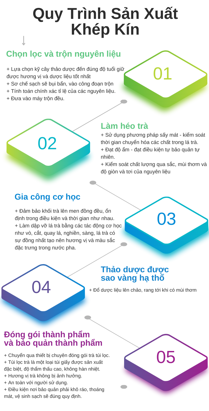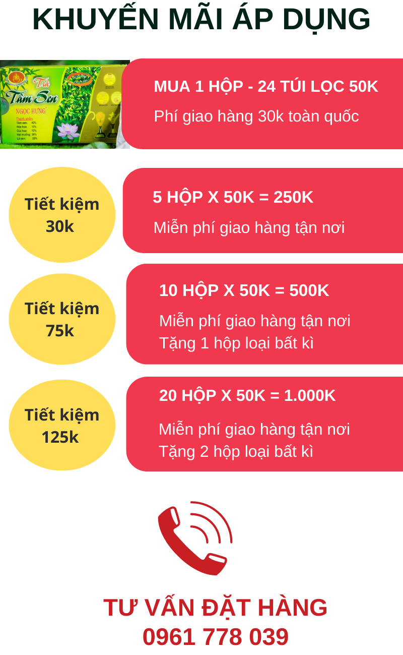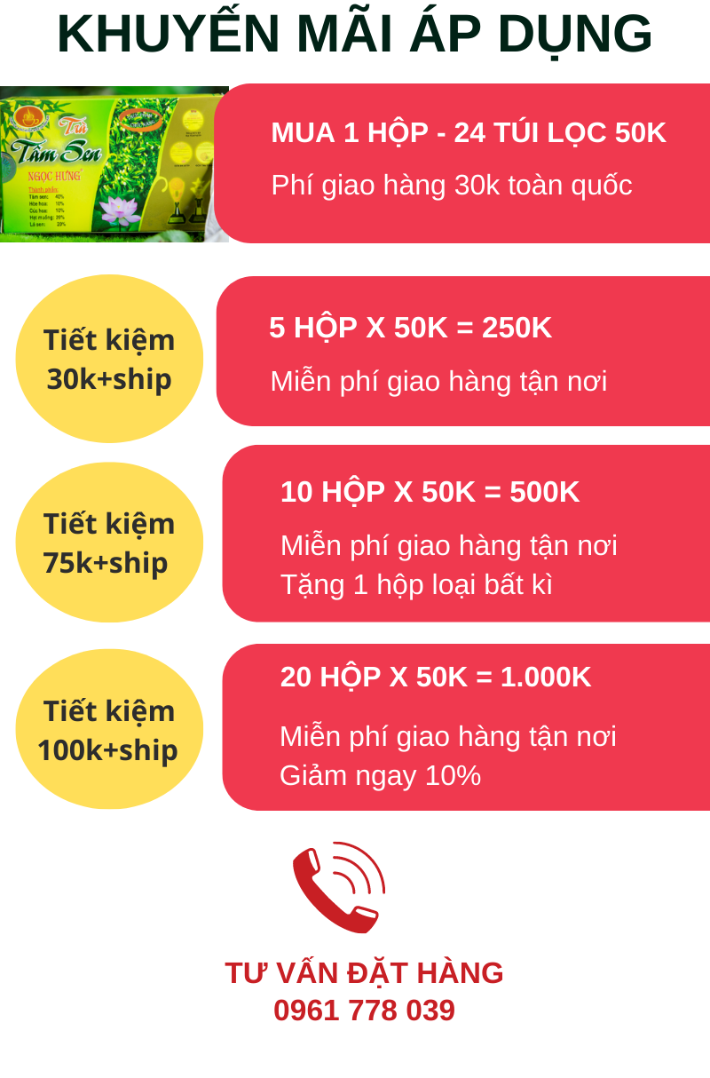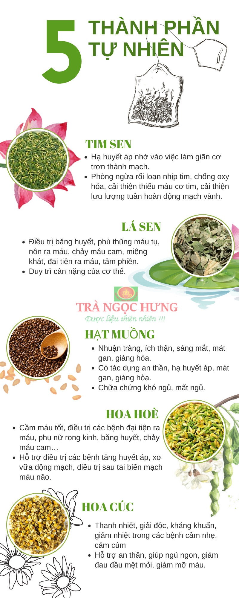 • Thành phần: Tâm sen 40%, Hoa Hoè 10%, Hoa cúc 10%, Hạt muồng 20%, Lá sen 20%